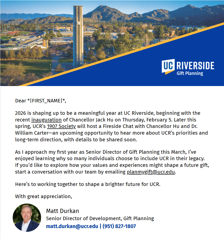 Browse past editions of our e-newsletter with stories, insights, and resources on creating a lasting legacy at UC Riverside.